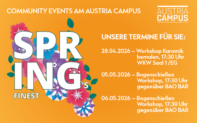Die Spring’s Finest-Workshops sind für alle Mitarbeitenden der Unternehmen des Austria Campus kostenfrei, um Anmeldung wird gebeten.
